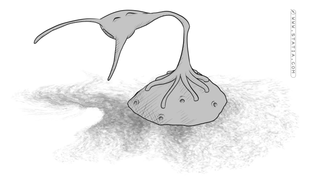 When Cat came near enough to touch one of the pillars, he quickly reconsidered. The bumps seemed to be strange, slimy looking pods, stuck to a long thick stalk, or perhaps growing out of it. Each pod varied in size, but all had the same strange dots on them. They were little holes. Cat almost felt as though they were eyes, peering out at him. He retracted his paw from the nearest one. It made a gurgling sound.