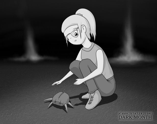 Shaking, Xecia braced herself and with one quick motion, snatched the little horror up with both hands. Holding it a handspan from her face, she looked into its eyes, like little round worlds buried in a pit of goo. She screamed and dropped it in her lap. Panicking, she leapt to her feet, flailing her arms madly trying to get it off.
