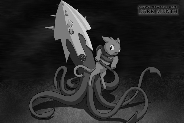 Rising from his chair, Cat awaited the arrival of this undesirable meeting. The oval door irised open to reveal a short and stubby Octopousse with a frown and an eye patch, followed by a hallway full of towering squid with long thick tentacles and armoured crowns. Their mouths clenched with a ring of teeth, their limbs flailing about, seeming to be hunting for prey. Running against the Observation Deck's numerous storage boxes was thwarting their attempts to a degree.